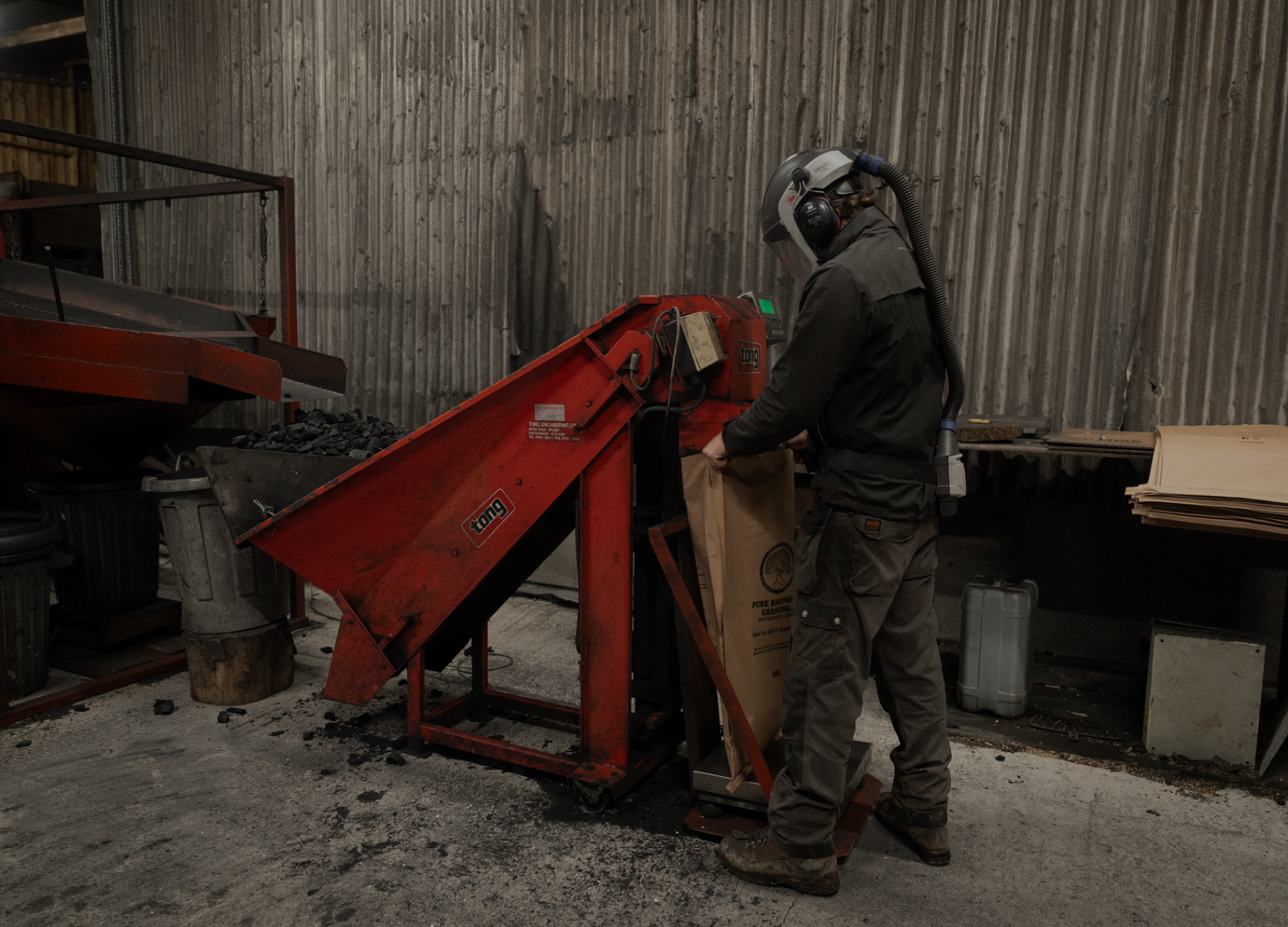 Once the charcoal is below 40C, it’s emptied from the retort and is ready for grading. The charcoal passes over a filter which sorts the chunks, leaving dust and small bits behind and allowing the larger pieces to graduate into craft bags. Each craft bag is hand-sealed to keep the contents clean and contained.
